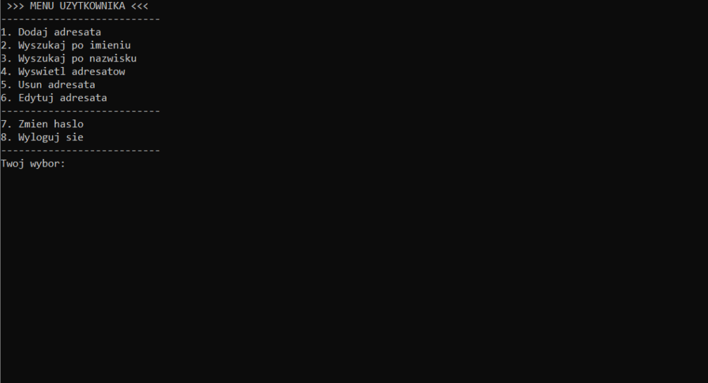 Jednym z moich projektów edukacyjnych w języku C++ była konsolowa aplikacja książki adresowej. Program pozwala na rejestrację użytkowników oraz zarządzanie kontaktami (tzw. adresatami). W tym wpisie opiszę funkcjonalność aplikacji, strukturę kodu, sposób organizacji klas oraz podejście obiektowe, jakie zastosowałem – łącznie z dziedziczeniem, kompozycją i zależnościami. Na końcu znajdziesz również diagram UML obrazujący strukturę klas.