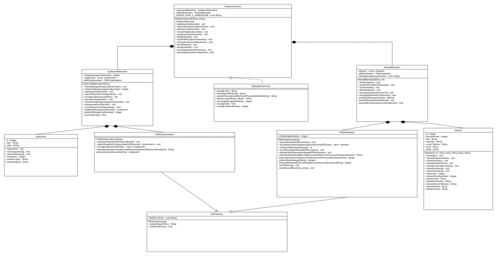 Program bazuje na kompozycji – np. KsiazkaAdresowa zawiera obiekty klas AdresatMenedzer i UzytkownikMenedzer. Dzięki temu każda instancja tych menedżerów działa razem z główną klasą aplikacji.
